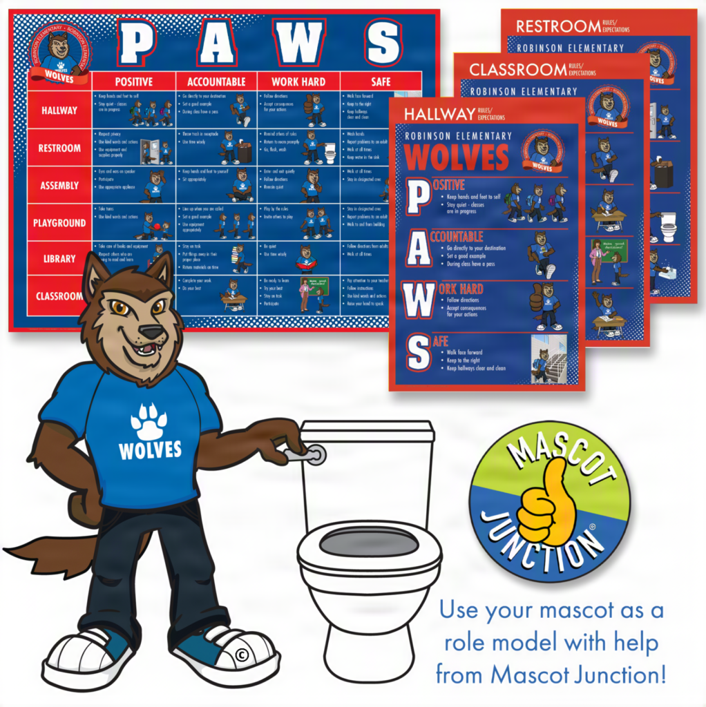 This PBIS matrix poster features a PAWS theme and a wolf mascot demonstrating targeted positive behaviors of the school’s PBIS program. By using the wolf mascot as a role model this school made it’s program more engaging and inclusive. Featuring the wolf promotes a strong sense of community and blends seamlessly with everything else the school does.