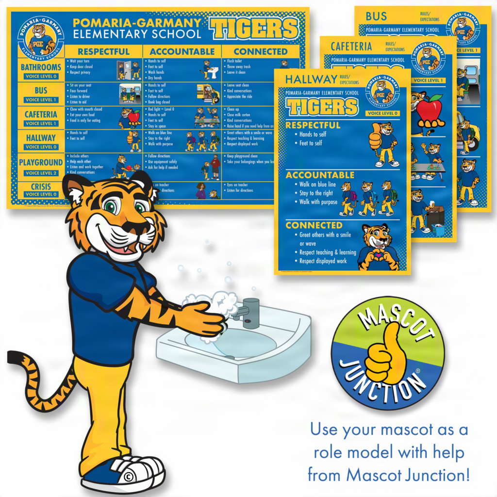This PBIS matrix poster features a tiger mascot demonstrating targeted positive behaviors of the school’s PBIS program. By using the tiger mascot as a role model this school made it’s program more engaging and inclusive. Featuring the tiger promotes a strong sense of community and blends seamlessly with everything else the school does.